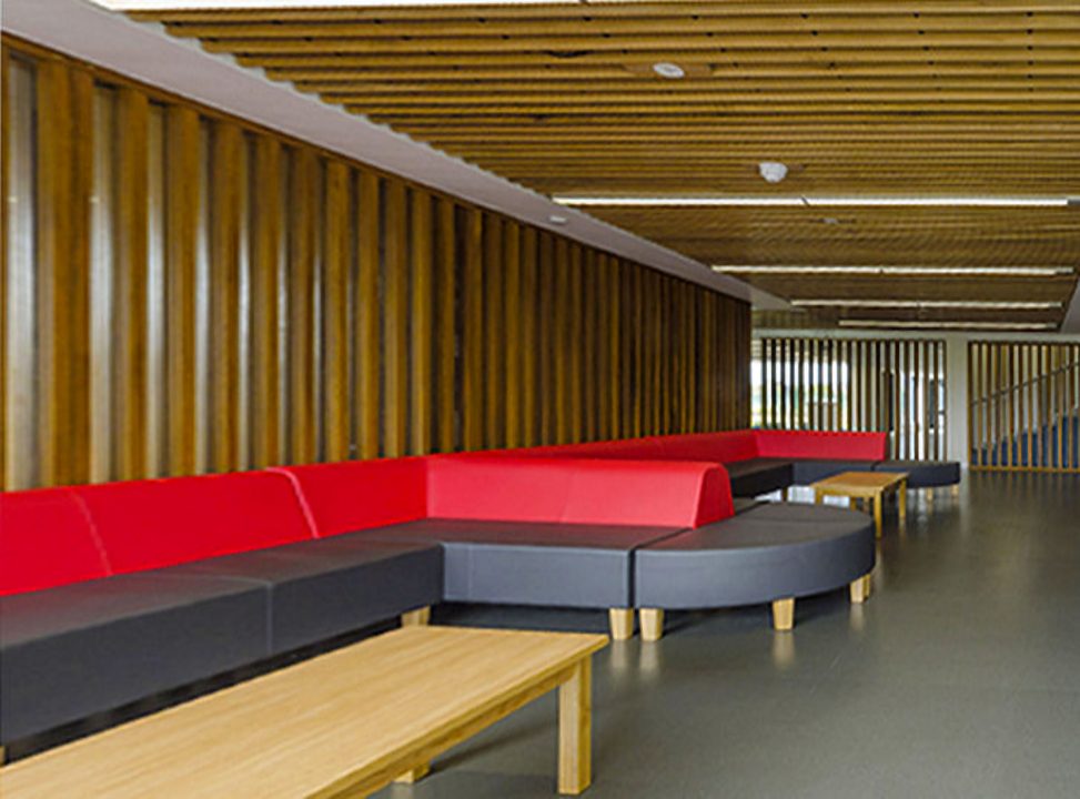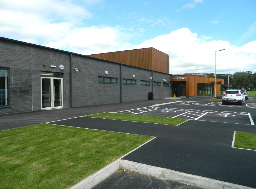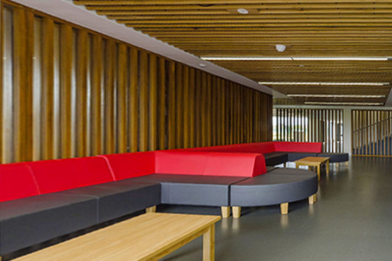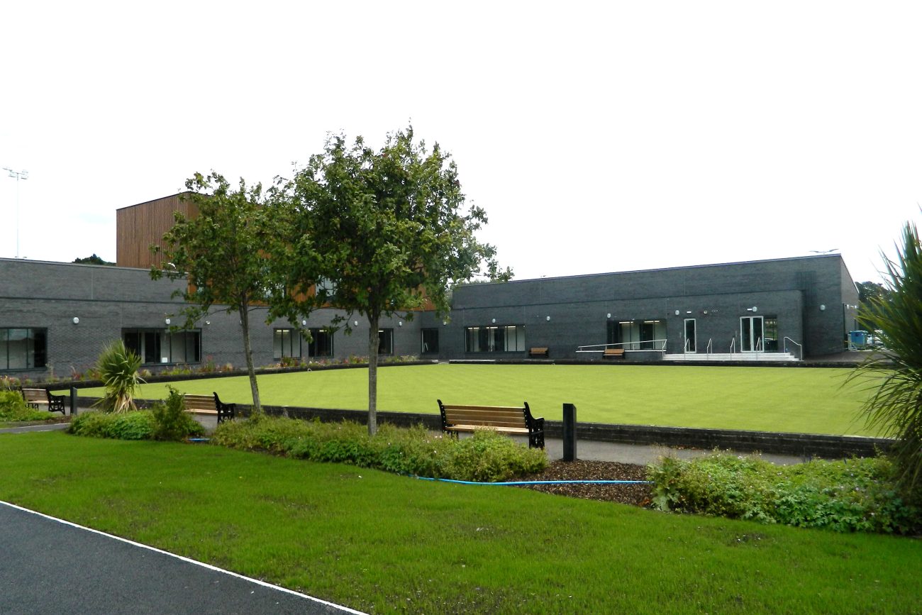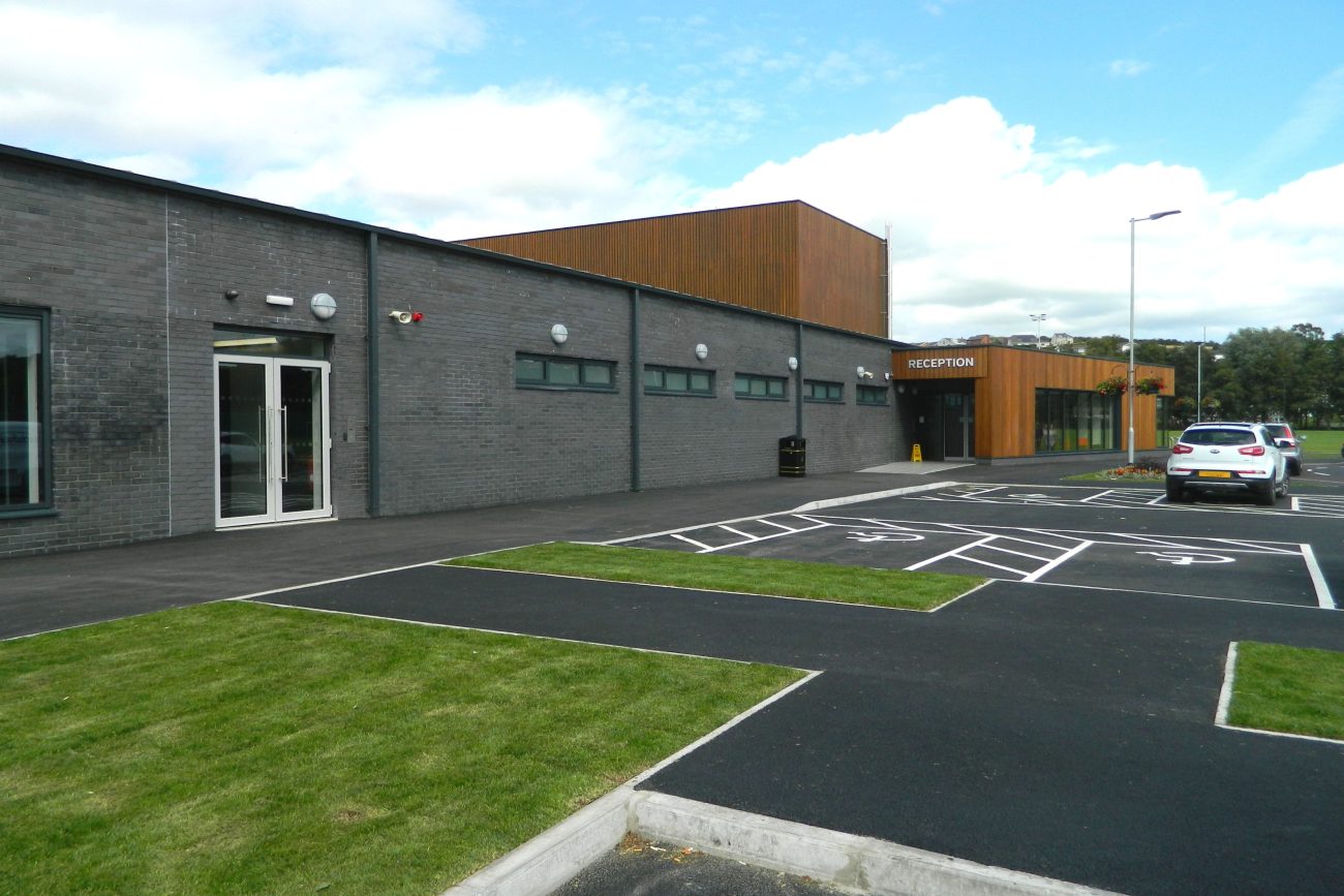 The main pavilion building comprises a structural steel frame with two single-storey, monopitch sections separated by a two-storey section. A single-storey flat roof circulation corridor runs the full length of the building at one side.